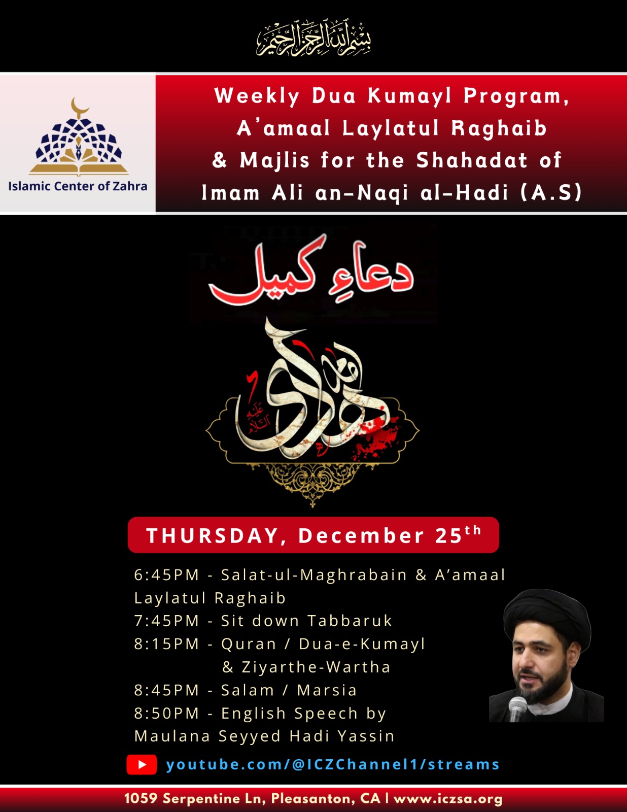 | Quran, Dua-e-Kumayl, Ziyrath-e-Wartha | 8:15 PM |
