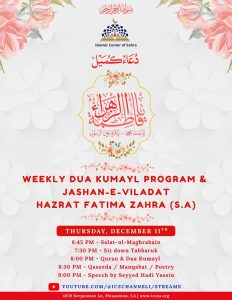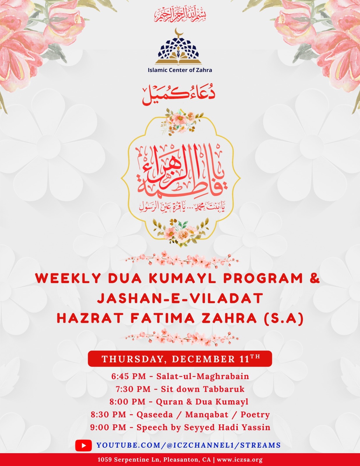 | Quran, Dua-e-Kumayl, Ziyrath-e-Wartha | 8:05 PM |